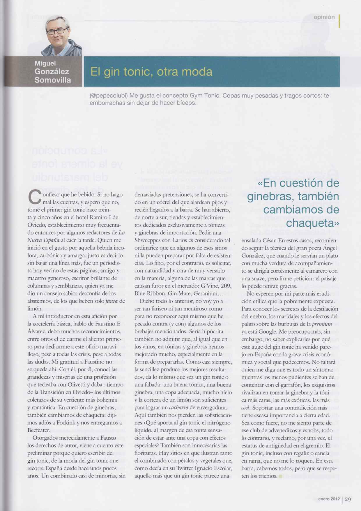Confieso que he bebido. Si no hago mal las cuentas, y espero que no, tomé el primer gin tonic hace treinta y cinco años en el hotel Ramiro I de Oviedo, establecimiento muy frecuentado entonces por algunos redactores de La Nueva España al caer la tarde. Quien me inició en el gusto por aquella bebida incolora, carbónica y amarga, justo es decirlo sin bajar una línea más, fue un periodista hoy vecino de estas páginas, amigo y maestro generoso, escritor brillante de columnas y semblanzas, quien ya me dio un consejo sabio: desconfía de los abstemios, de los que beben solo fanta de limón.