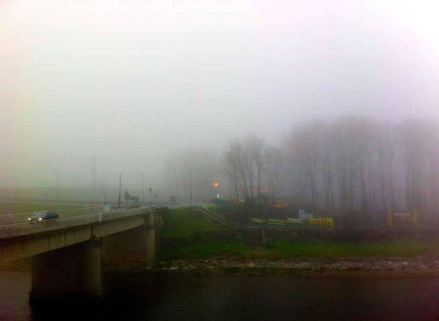 He vuelto a sentir la niebla estos últimos días, en una visita fugaz y navideña a Arriondas. Ya la había contemplado el pasado verano, cuando hice esta foto del puente (ahora lleva más agua que entonces), visto desde la pasarela del parque: un enlace perdido y lejano en medio de la bruma. A mediodía, si vence el sol, suele levantarse el telón y ya todo parece distinto hasta que las nubes retornan caprichosamente. La niebla tiene sus propias melodías, sus notas particulares, sus canciones: Donde la neblina posa.