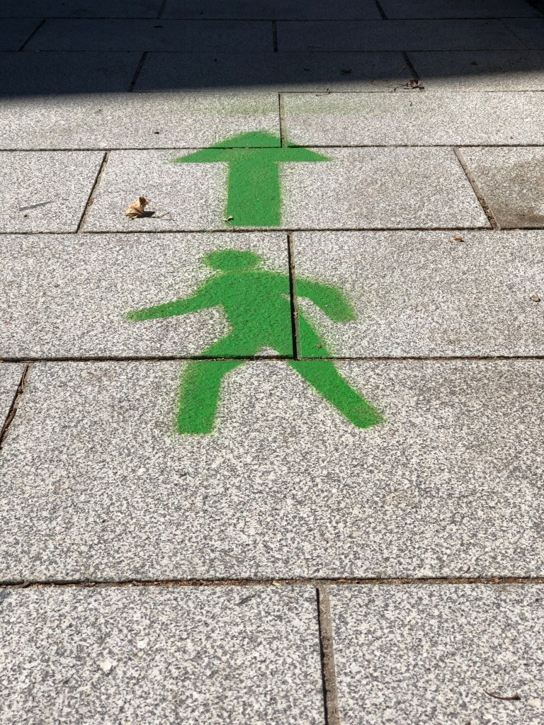 Hace una semana, las aceras próximas a estos sitios aparecieron ilustradas con estas siluetas verdes de la foto, que indican los caminos de ida y vuelta, con el propósito de que los escolares y sus acompañantes guarden cierto orden y distancia en sus idas y venidas al centro educativo. Era muy temprano cuando pasé hoy por allí y apenas pude atisbar la entrada de algunos docentes afanados en la apertura de puertas y ventanas: hay que airear. En tiempos de mutación también se adaptan (o se adoptan) las antiguas consignas revolucionarias: ventilémonos todos en la lucha final. (No pretendo frivolizar: soy consciente del dolor y el sufrimiento que, en todos los órdenes y en todas las latitudes, ha causado y causa esta pandemia).