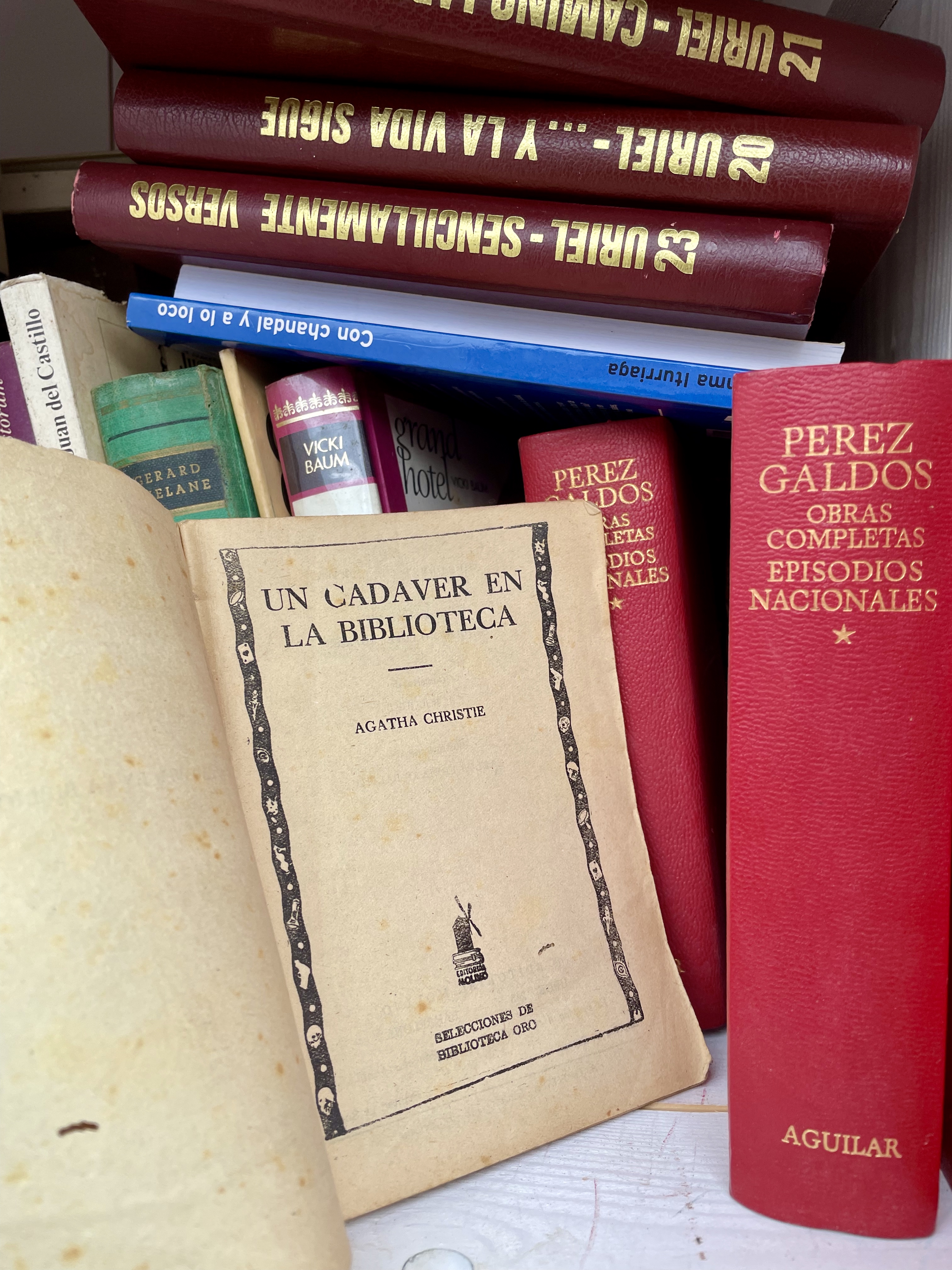 Confieso que no he leído ese relato de Agatha Christie, Un cadáver en la biblioteca, pero me pareció inquietante que estuviera allí tan a la vista, como si fuera un mensaje en clave o un guiño macabro. No le di más importancia, pero volví al día siguiente y, para mi sorpresa, ya no lo encontré. El cadáver del armario, o sea el libro, había desaparecido. ¿Quién se interesó por aquel ejemplar viejo y desmadejado? Había volado el muerto, pero, por contra, sí aprecié, apilado con otros, un título en el que no había reparado en las visitas anteriores: una edición del Quijote de Avellaneda. En una plaza de nombre Cervantes y con una escultura que parece inspirada en el caballero andante casi en frente, me pareció una afrenta que alguien pusiera allí el Quijote apócrifo que tantos disgustos le dio a don Miguel.