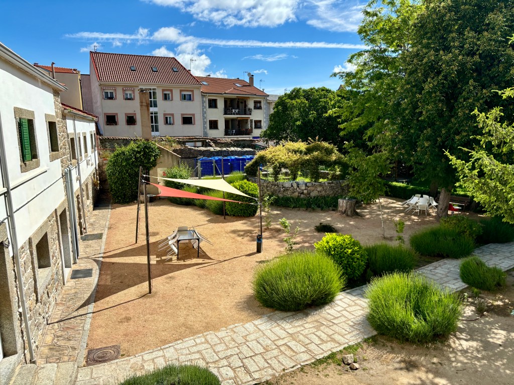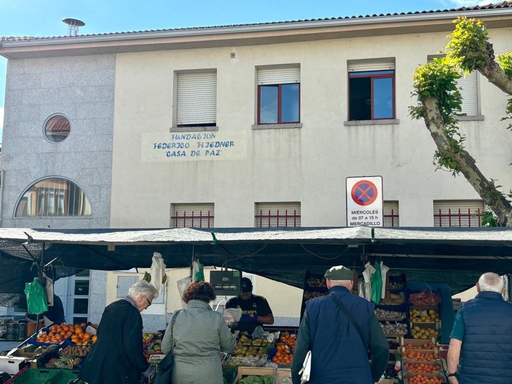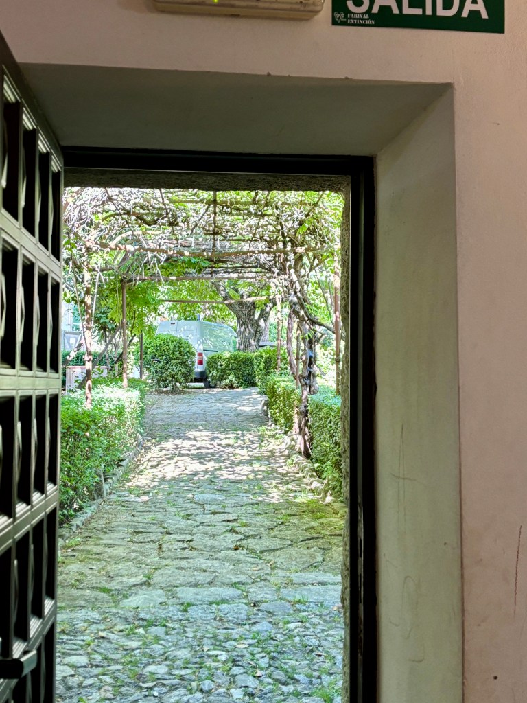 Desde las ventanas de la Casa de Paz que dan a la plaza de España de El Escorial se ve el edificio de la biblioteca municipal de la villa, que muestra en la fachada el nombre del más popular de los autores clásicos: Homero. Resulta tentador hacer comparaciones e imaginar odiseas, pero parece una frivolidad aludir aquí a viajes literarios. Estos seres humanos han abandonado sus casas por necesidad, sin Ítaca alguna en el horizonte. La puerta de enfrente, en el lado opuesto a la ventana, comunica con el jardín, otro de los elementos característicos de esta finca. En un extremo del parque se cultiva el pequeño huerto, atendido por los residentes con la colaboración de vecinos de El Escorial.