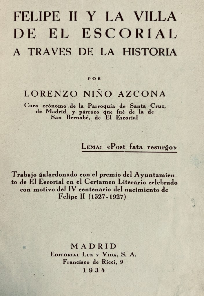 - Niño Azcona, Lorenzo, Felipe II y la villa de El Escorial a través de la historia, Editorial Luz y Vida, Madrid, 1934. ↩︎