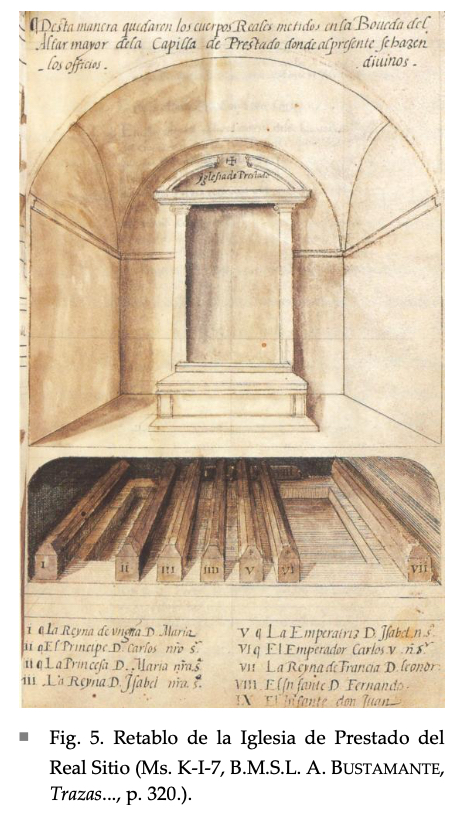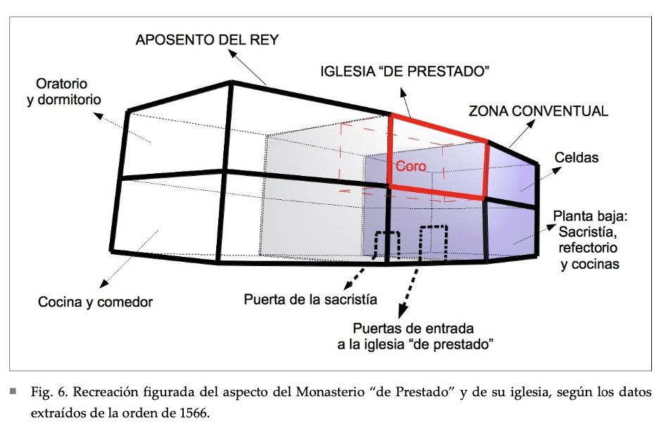 En la etapa filipina del Monasterio de Prestado, de acuerdo con las investigaciones de María Belén Díez-Ordás Berciano sobre la instrucción firmada por el rey en 1566, estuvieron depositadas en su capilla mayor obras de arte de Rogier Van der Weyden, Tiziano y Joachim Patinir, entre otros. El destino final de los cuadros era el monasterio de San Lorenzo, todavía en construcción5. Las figuras del Convento de Prestado reproducidas aquí debajo proceden del estudio de Díez-Ordás, aparecido en 2011 en la revista De arte de la Universidad de León.