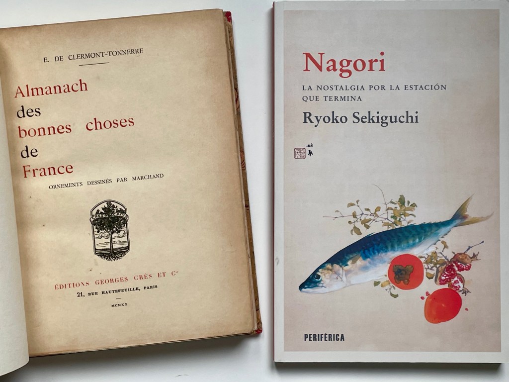 Ryoko Sekiguchi no menciona a Élisabeth Gramont en su breve ensayo, probablemente porque no haya tenido noticia de la existencia del Almanach, en su día un éxito editorial y hoy una obra totalmente olvidada y difícil de encontrar hasta en librerías anticuarias. En una de esas manías de bibliófilo que experimento, he colocado juntos ayer los libros de ambas autoras. Y ahí están, compartiendo estante y nostalgias, la edición española de Nagori (Periférica, 2023, traducción de Regina López Muñoz) y la francesa del Almanach, publicada por Georges Crès y Cía en el París de los años veinte del pasado siglo. Las estaciones y las personas pasan, pero los lectores y los libros, como algunos aromas y sabores, permanecen en la memoria… y en las obras de Marcel Proust. ¡Feliz 2024!