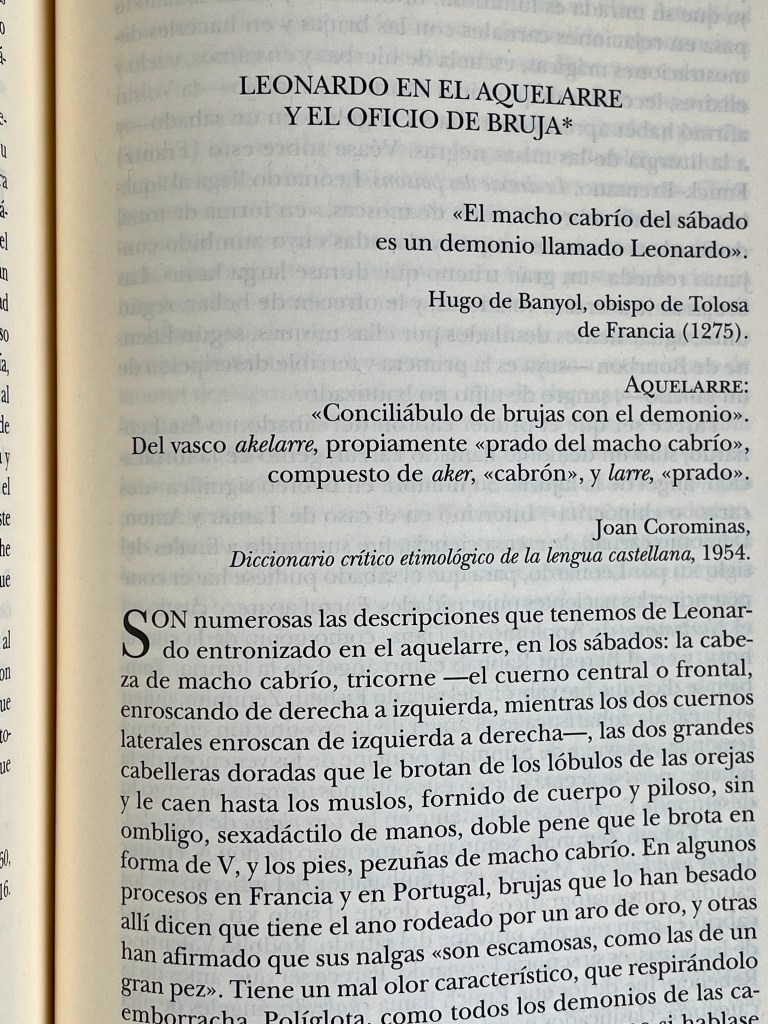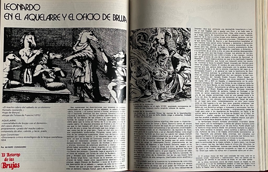 Es vox pópuli la querencia y el interés de Cunqueiro por los asuntos relacionados con los demonios y la brujería, a los que dedicó decenas de comentarios. En los diez capítulos que conforman Al pasar de los años hay dos relacionados con estos temas: «Aprendiz de brujo» y «Notas para un diccionario de ángeles». Para este último apartado seleccioné, entre otros, el trabajo publicado por don Álvaro en la revista Jano el 14 de noviembre de 1972: «Leonardo en el aquelarre y el oficio de bruja».